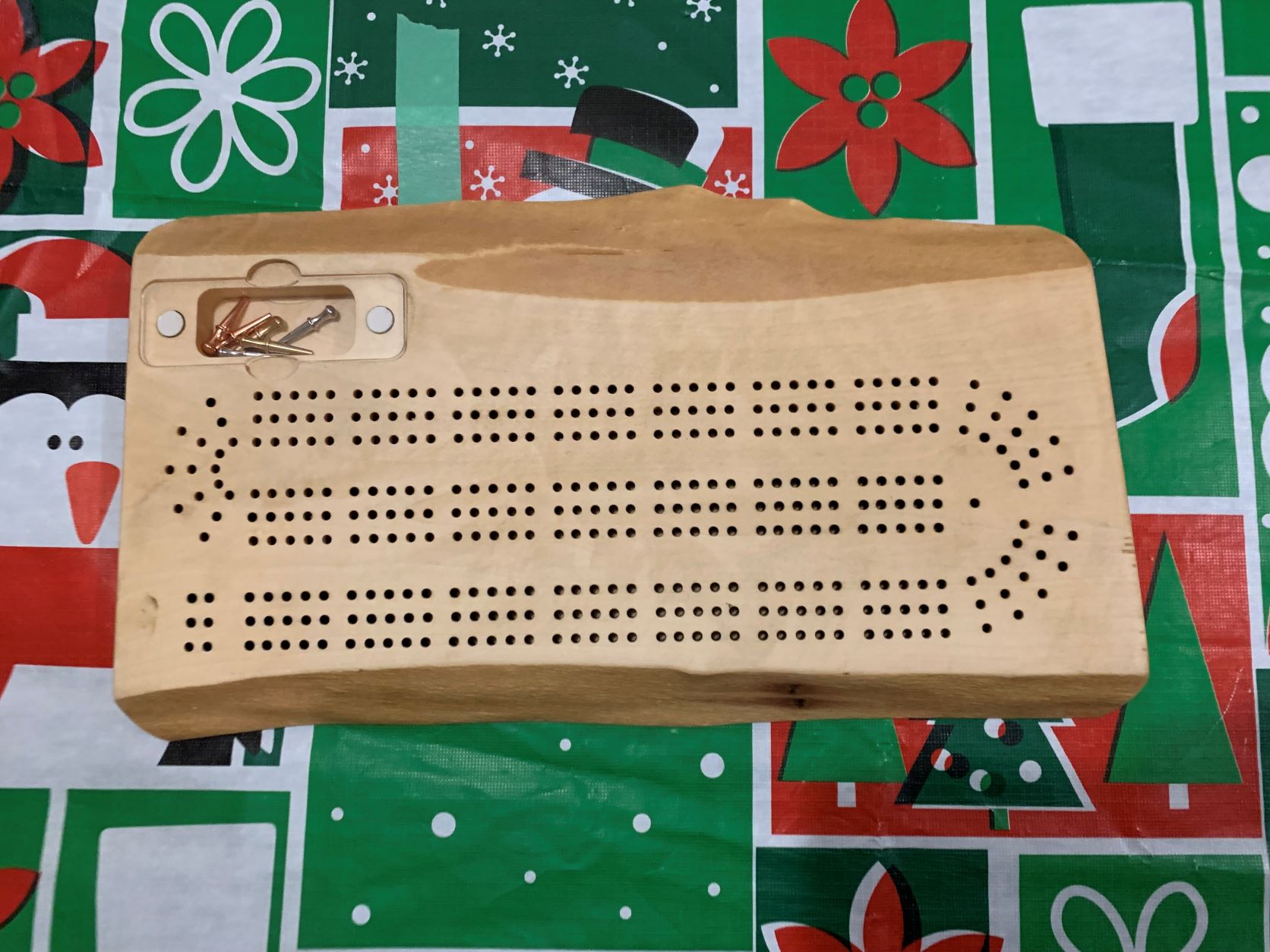 Live-edge cribbage boards with a pocket for the pegs. The peg pocket lids have magnetic enclosures. Various hardwoods, finished with Tried and True oil finish (linseed and beeswax). $50 each. There is open area on the board surface to laser engrave any desired customization.